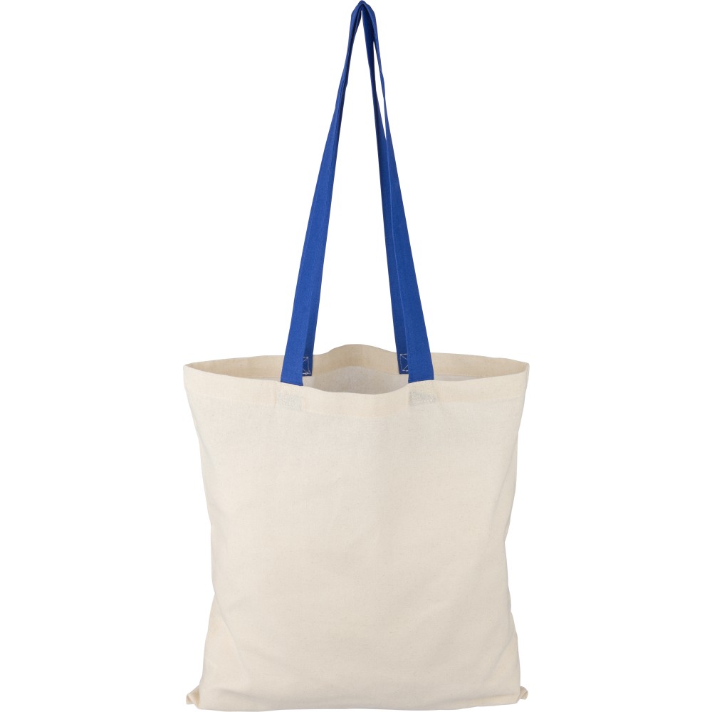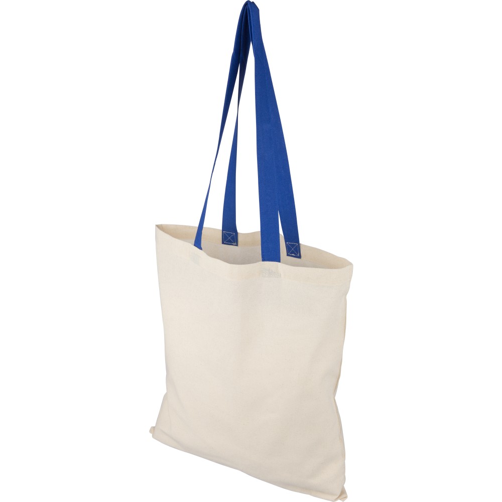 Oeko-Tex minősítésű, 140 g/m2 pamutból készült bevásárlótáska natúr színben, színes fülekkel. Mérete 38 × 42 cm, a fülek hossza 70 cm, szélessége 2,5 cm. Oeko-Tex címkével ellátva.