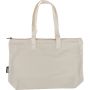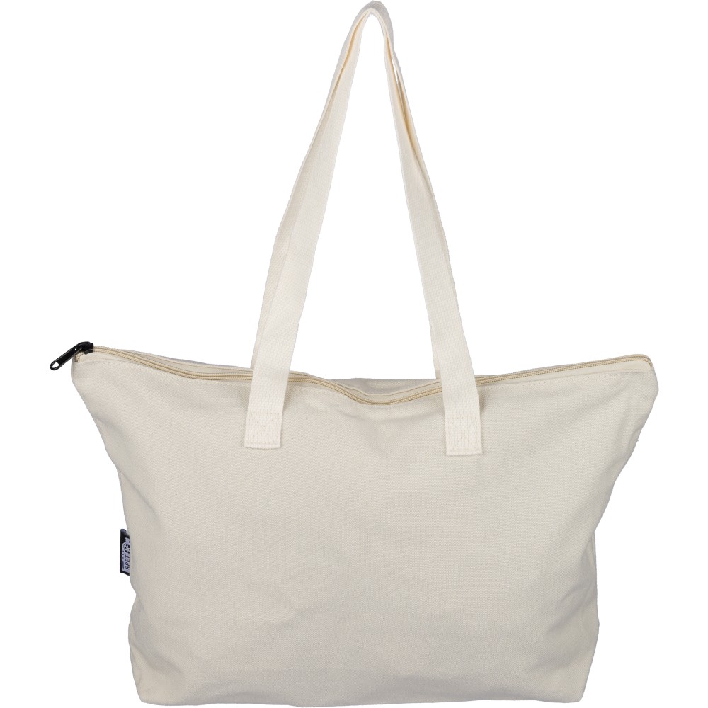 Újrahasznosított pamut-poliészter, 330 g/m2 kevertszövetből készült bevásárlótáska nagy, cipzáras felső rekesszel, 65 cm hosszúságú és 2,5 cm szélességű hosszú fülekkel, a táska színével harmonizáló hevederrel. Külső felületén rPET címkével, belső részén további címkével ellátva.