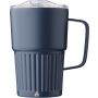 Újrahasznosított rozsdamentes acél útibögre, 450 ml. A belső 304-es, a külső 201-es rozsdamentes acélból készült, bordás markolattal és masszív fogantyúval, műanyag, csúszózáras fedéllel. Gravírozott újrahasznosított logó található a bögrén. Csomagolása barna papírdoboz.