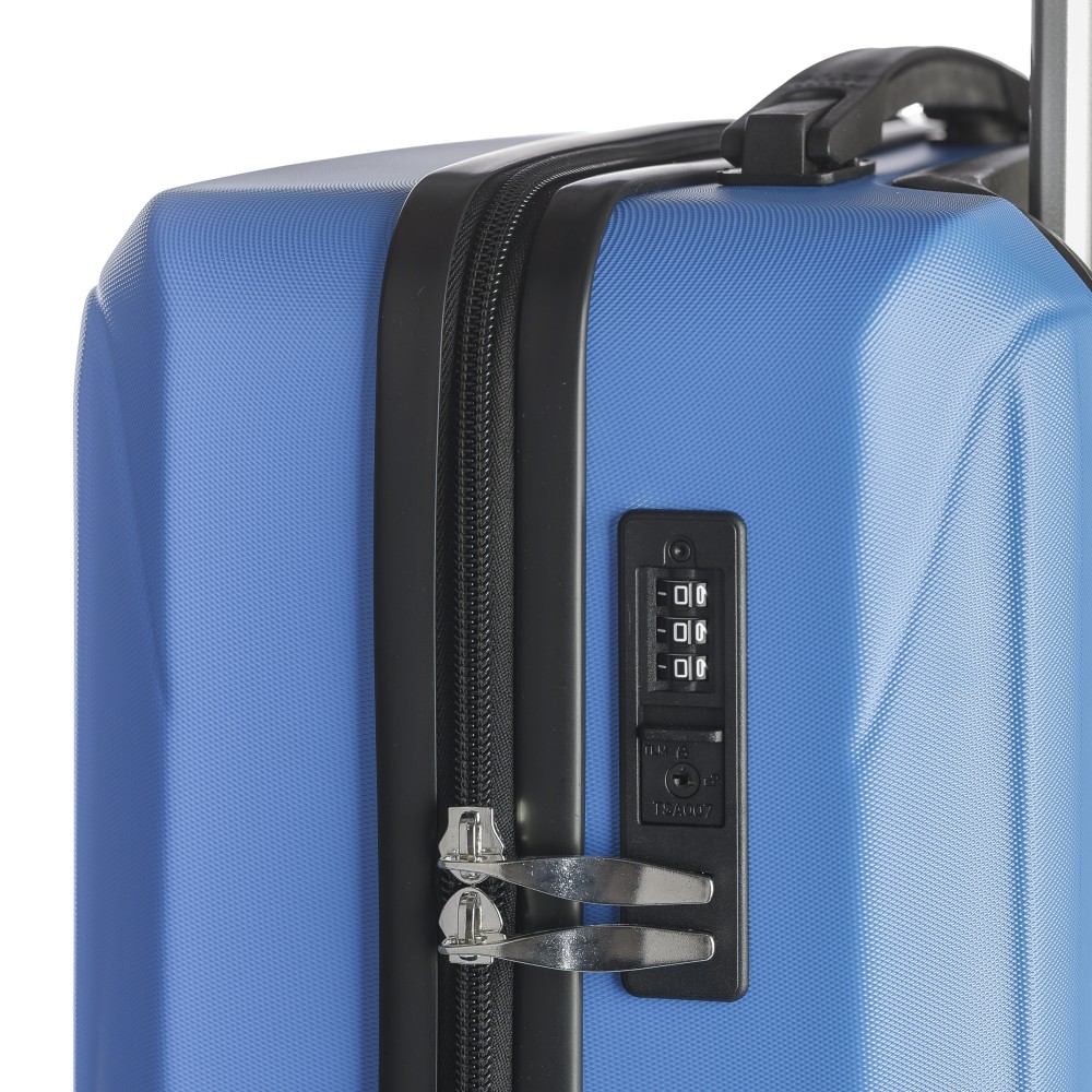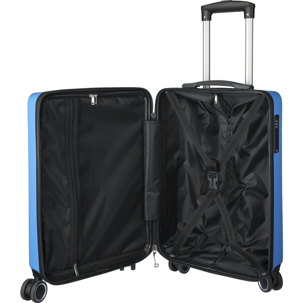 Keményfedeles ABS gurulós bőrönd 8 kerékkel (4x2), és háromszintű fém fogantyúrendszerrel. Felső műanyag fogantyút, számkombinációs zárat és 3M ragasztócsíkkal rögzíthető gravírozható táblát tartalmaz. A belső bélés anyaga 210D, a táskán belül 3 rekesz áll rendelkezésre: U-cipzáras zseb, hálós zseb és X-alakú, csattal záródó gumis heveder. Űrtartalom: 30 liter. Csomagolása barna papírdoboz.