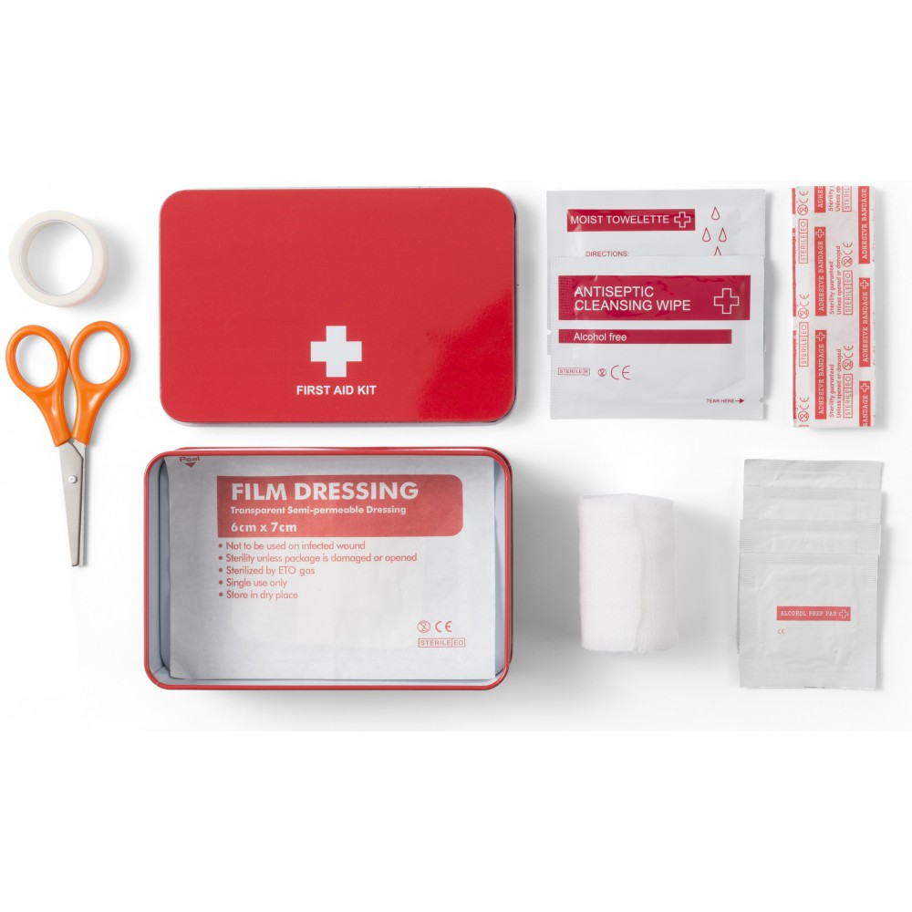 Elsősegélykészlet fém dobozban 15 kellékkel: olló, nedves törlőkendő, ragtapasz, 4 alkoholos törlőke, 5 ragtapasz, 1 gézlap, 1 fertőtlenítő törlő.