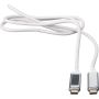 Töltőkábel alumínium csatlakozókkal. Hossza: 1 méter. USB-C-ről USB-C-re. Teljesítmény: 65 W. Kék töltési sebességet jelző lámpa az egyik aljzaton. Adatátviteli sebesség 480 Mbps.