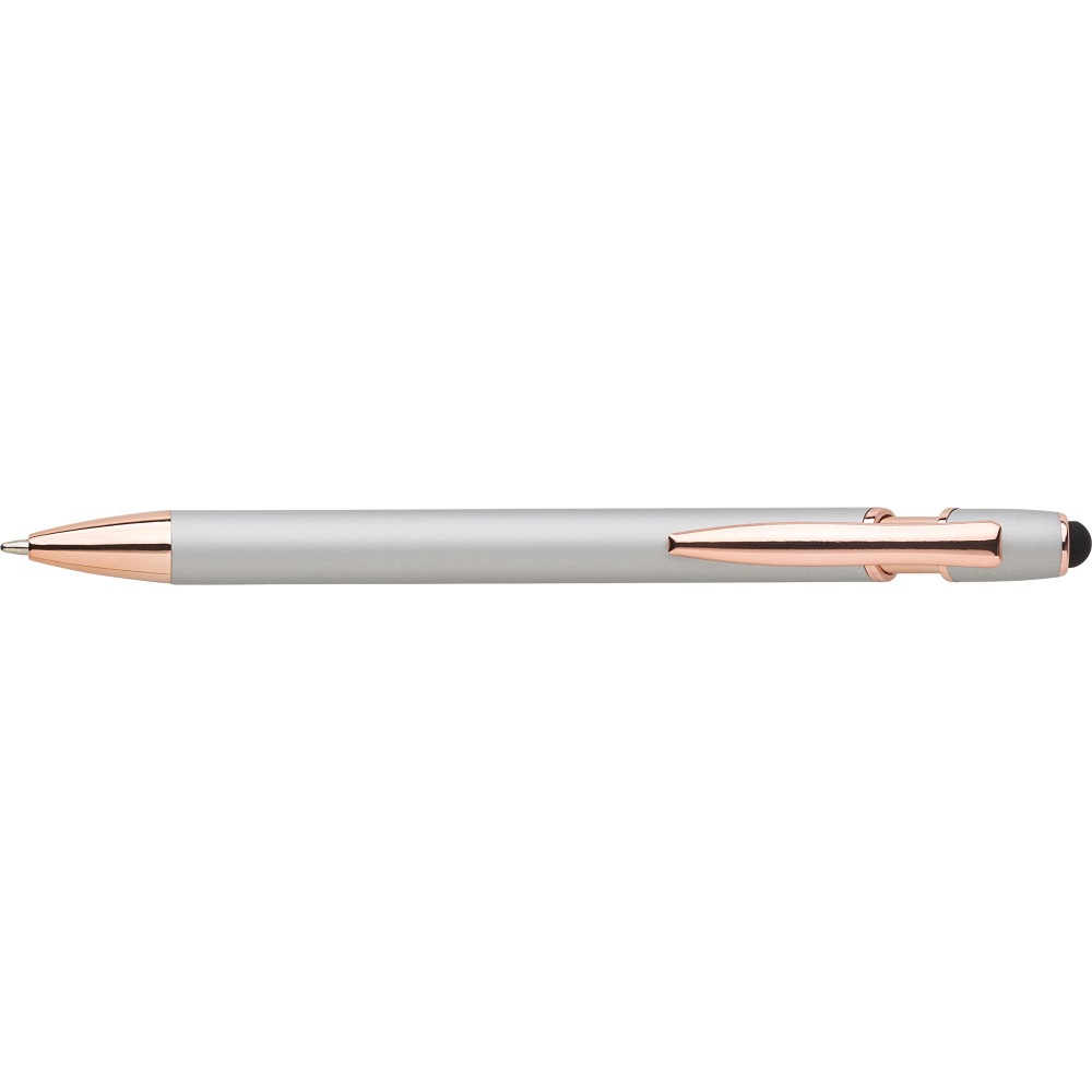Alumínium golyóstoll rózsaarany részletekkel és érintővel, kék tollbetéttel.