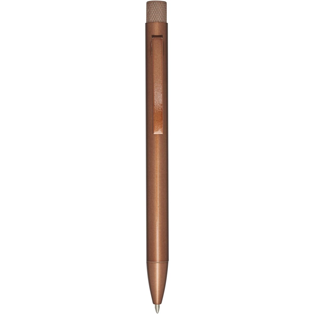 Golyóstoll színes festékszórt bevonattal. A gomb és a hegy sárgarézből, a tollteste újrahasznosított sárgarézből, a klipsz pedig vasból készült. Kék tollbetéttel. Írási hossz: 1000 méter. Hegyméret: 1,0 mm. Ajándékdobozban szállítjuk.
