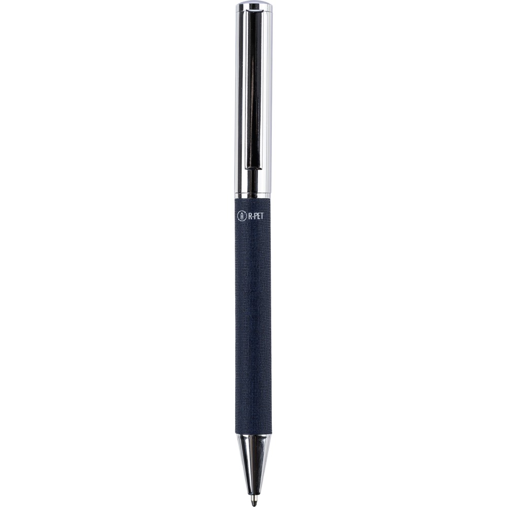 Sárgaréz és rPET csavaros golyóstoll fém klipsszel és markolattal. RPET logóval a tolltesten. Egyenként csomagolva barna kartondobozban. Kék tollbetéttel.