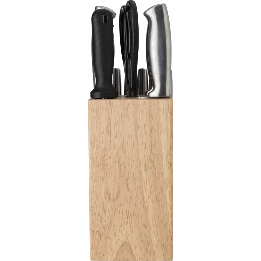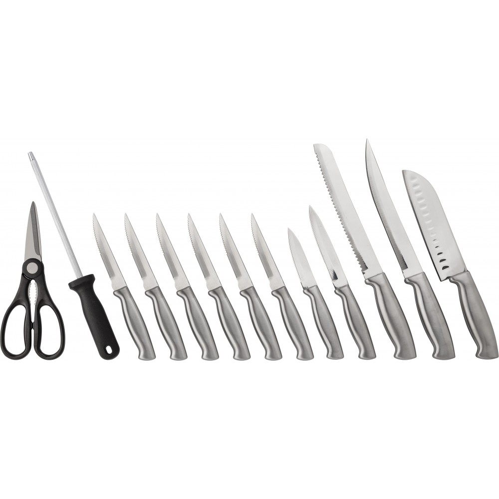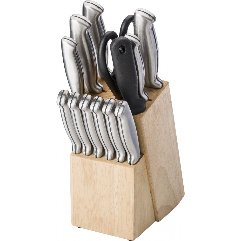 Konyhai készlet rozsdamentes acélból és PP műanyagból. A gumifa talp 13 db konyhai eszközt tartalmaz: olló, élező és különböző kések.