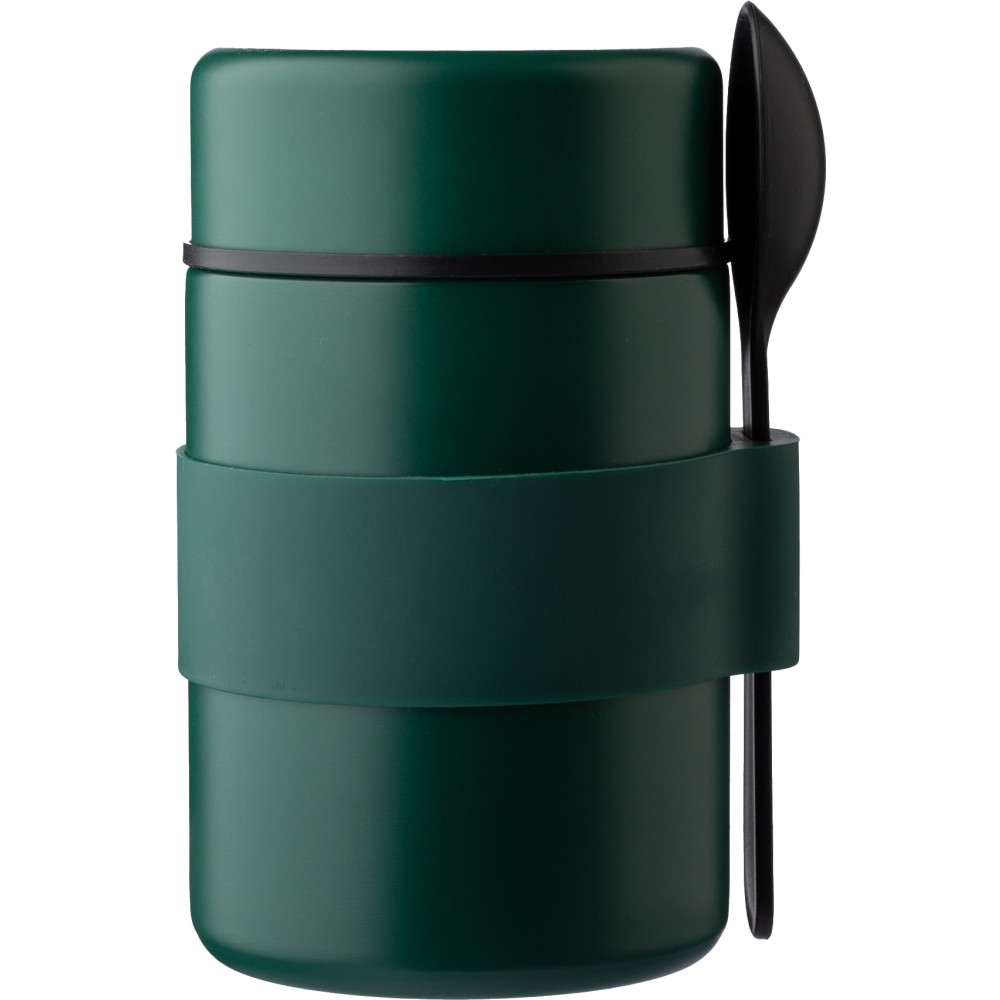 Rozsdamentes acélból készült duplafalú edény, fekete PP kanállal és az edény színével megegyező színű szilikon fogóval. Belül rozsdamentes acél 304, kívül rozsdamentes acél 201. PP fedéllel. Űrtartalom: 460 ml.