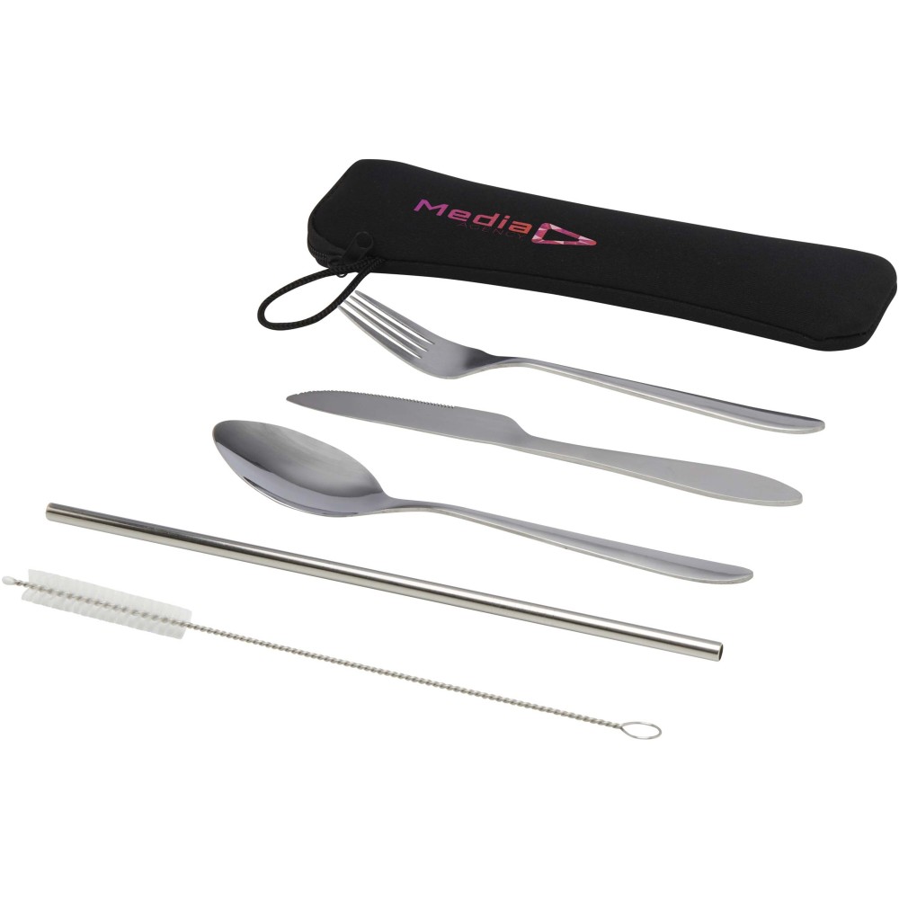 Evőeszköz-készlet, amely egy villát, kést, kanalat, szívószálat és egy tisztítókefét tartalmaz. Az evőeszközök tartós és könnyen tisztítható rozsdamentes acélból készültek. Cipzáras poliészter tasakban, praktikus hordozópánttal szállítjuk.