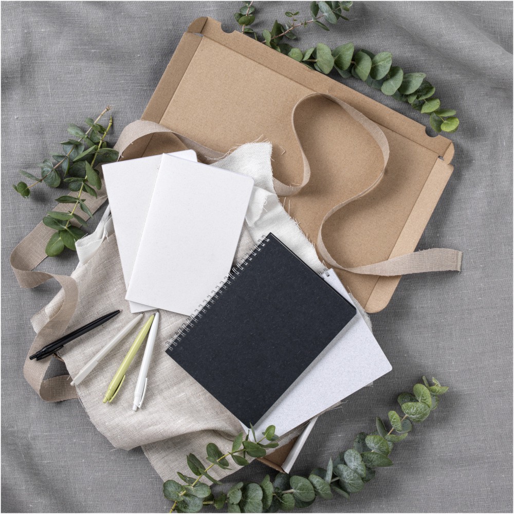 A5 méretű spirálfüzet FSC tanúsítvánnyal rendelkező papírfedéllel, mely pamuthulladékokból (15%), és újrahasznosított hulladékból (40%) készült. 80 lap, 80 g / m2 100% FSC újrahasznosított papír. Olaszországban készült. Pamut.