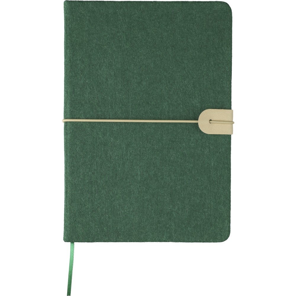 Újrahasznosított filcből készült jegyzetfüzet, kb. A5-ös méretű, 80 lapos. Puha tapintású kemény borítóval, gumiszalaggal és kívül PU zárópánttal. Szalagos könyvjelzővel és 70 g/m2-es vonalas papírral. A hátoldalán lézergravírozott újrahasznosított logóval.