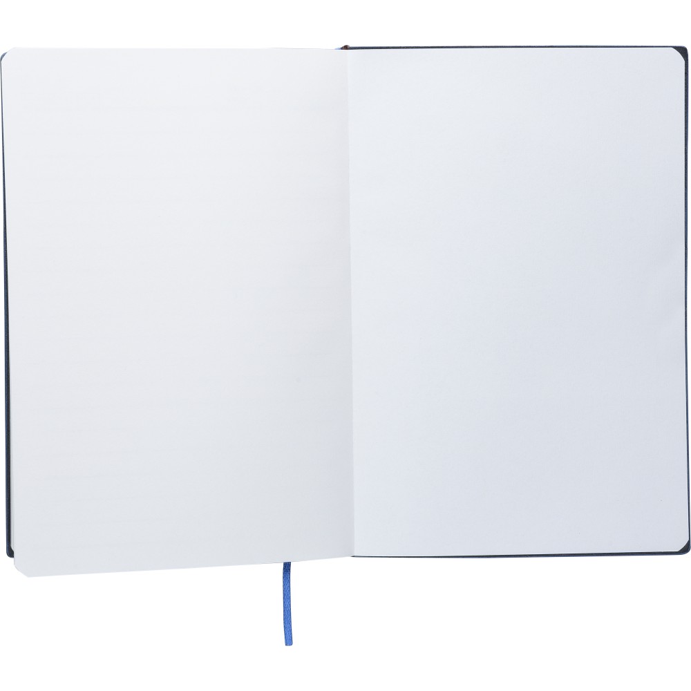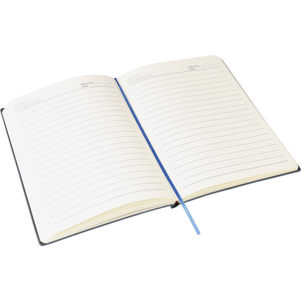 Újrahasznosított PU jegyzetfüzet, kb. A5-ös méretű, 100 lapos. Kemény borítóval és kordbársony hatású bevonattal az elülső és a hátlap felső részén. Tartalmaz egy szalagos könyvjelzőt és 80 g/m2-es vonalas lapokat. A hátoldalon dombornyomott újrahasznosított logóval.
