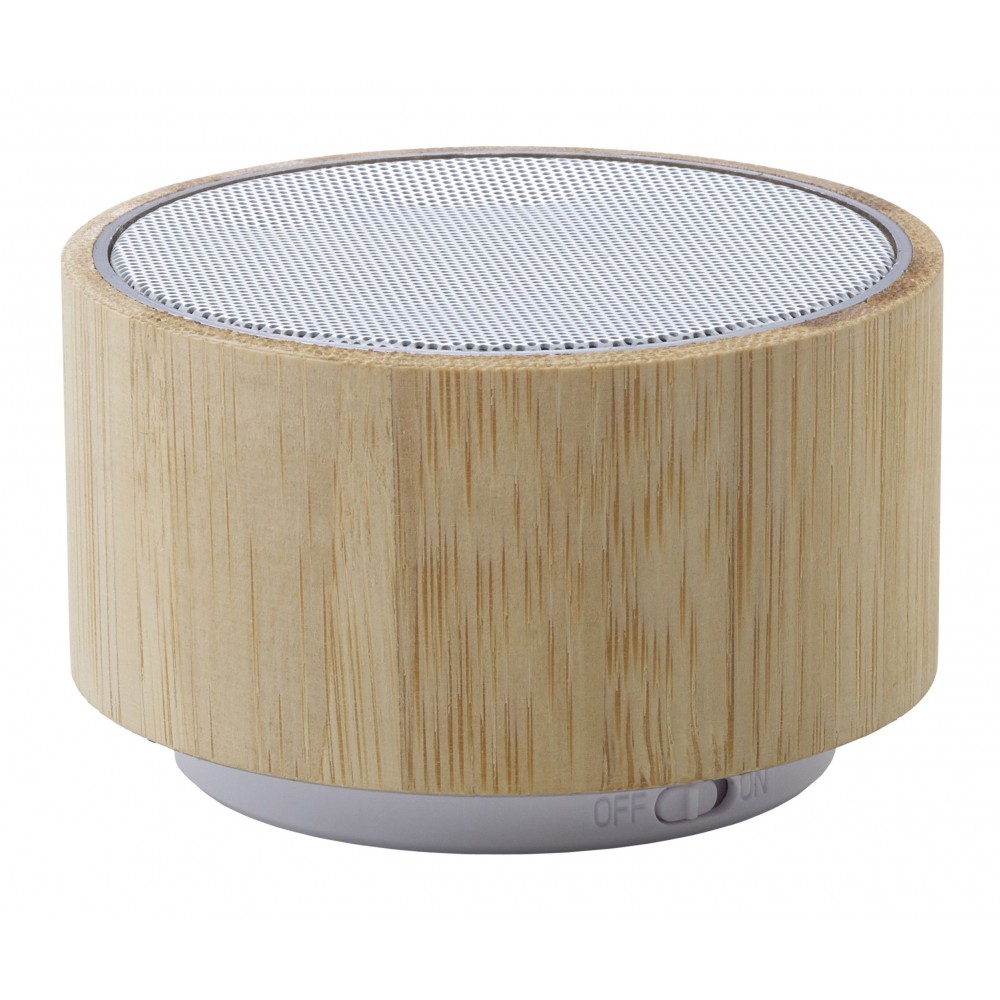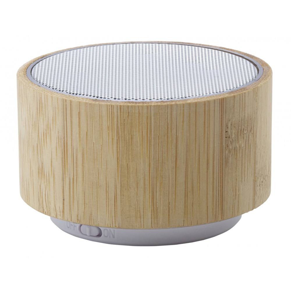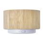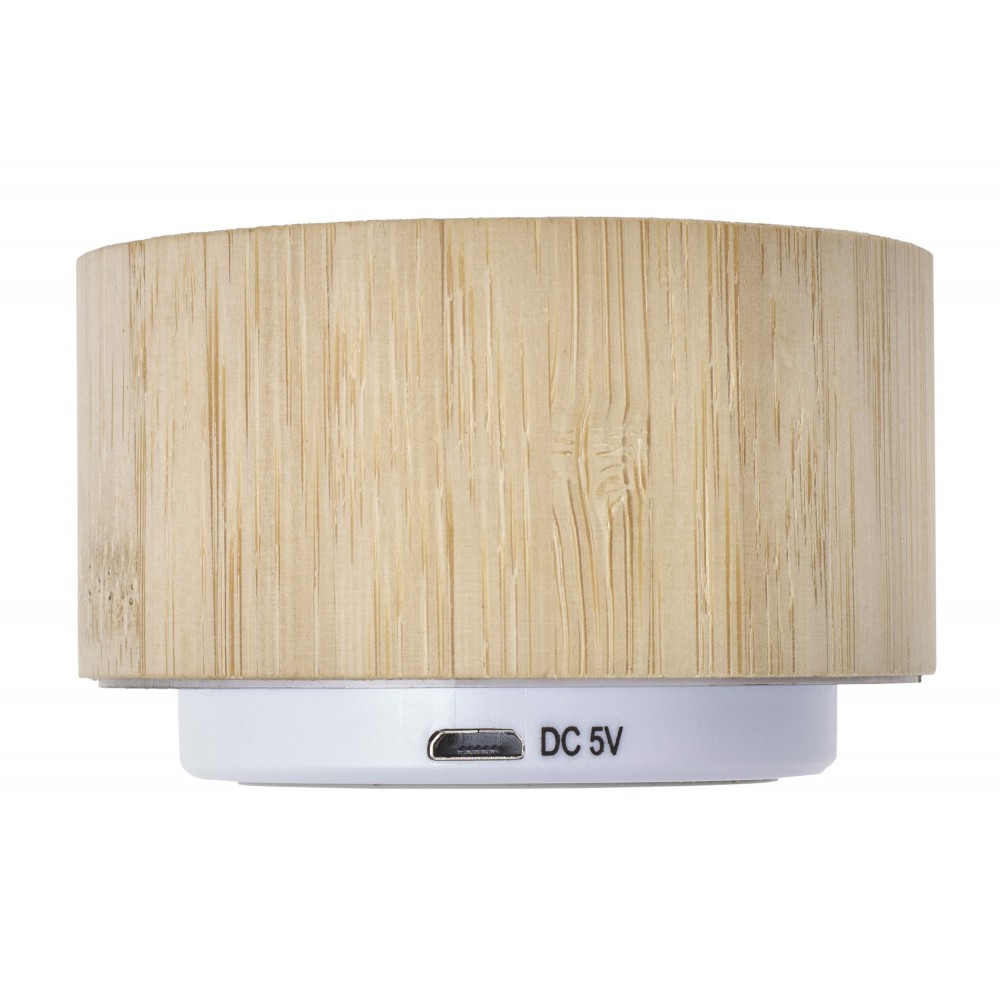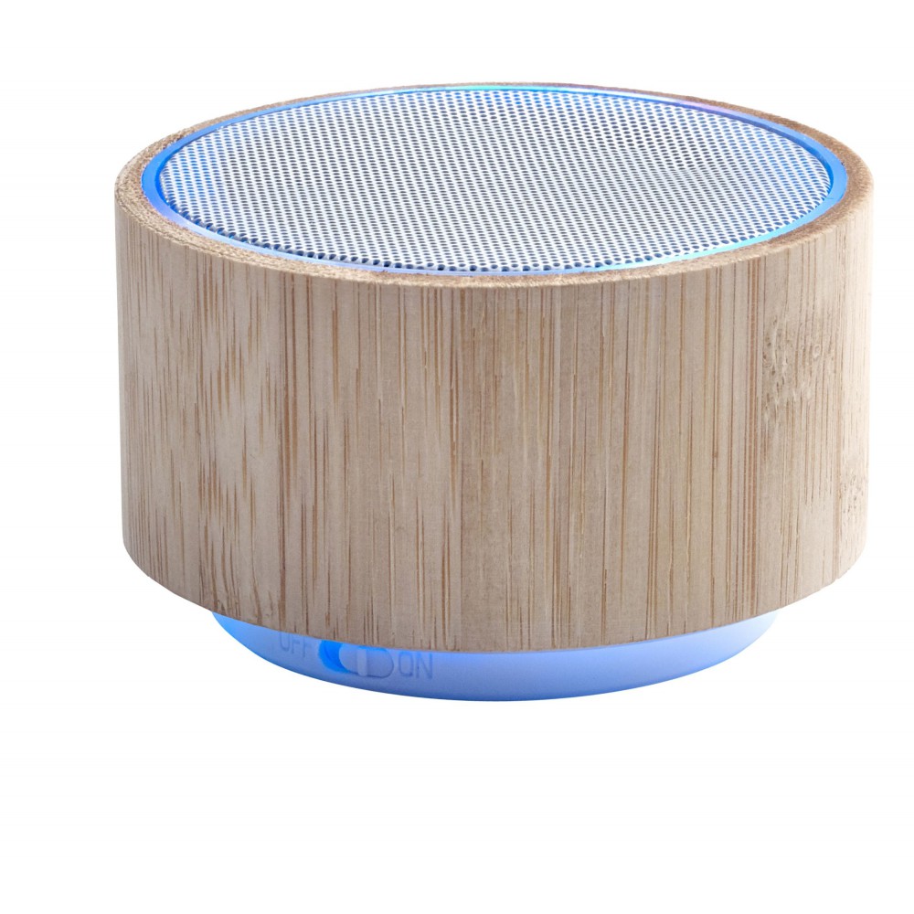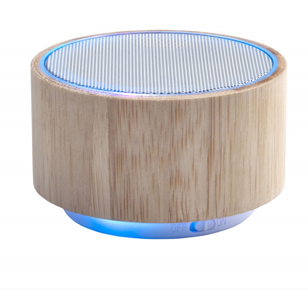 Vezeték nélküli hangszóró változó fénnyel, 3W teljesítménnyel, tölthető, 3 mAh-es li-ion akkumulátorral. Játszási idő egy töltéssel kb. 3 óra. A vezetéket tartalmazza. Csomagolása fehér doboz. Bambusz.