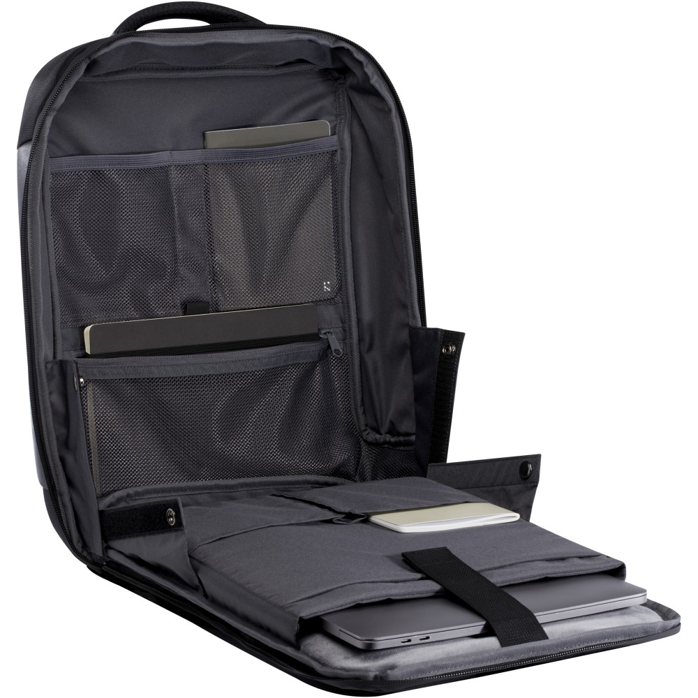 A karcsú, kompakt és masszív GRS tanúsítvánnyal rendelkező Expedition Pro laptop hátizsák tökéletes társ az úton lévő szakemberek számára. Vízlepergető 900D RPET anyagból készült, prémium PU elemekkel és RPET béléssel párosítva. Dedikált 15,6 -os laptoprekesszel, tablettartóval, több zsebbel, egy cipzáras elülső zsebbel és egy rejtett zsebbel közvetlenül a hátsó pánt alatt. Párnázott és állítható vállpántokkal, integrált kártyatartó zsebbel, napszemüvegtartóval, hálós hátlappal és párnázott fogantyúval készült, így biztosítva a maximális kényelmet és komfortot hordozás közben. Űrtartalma: 12 liter. PVC-mentes.