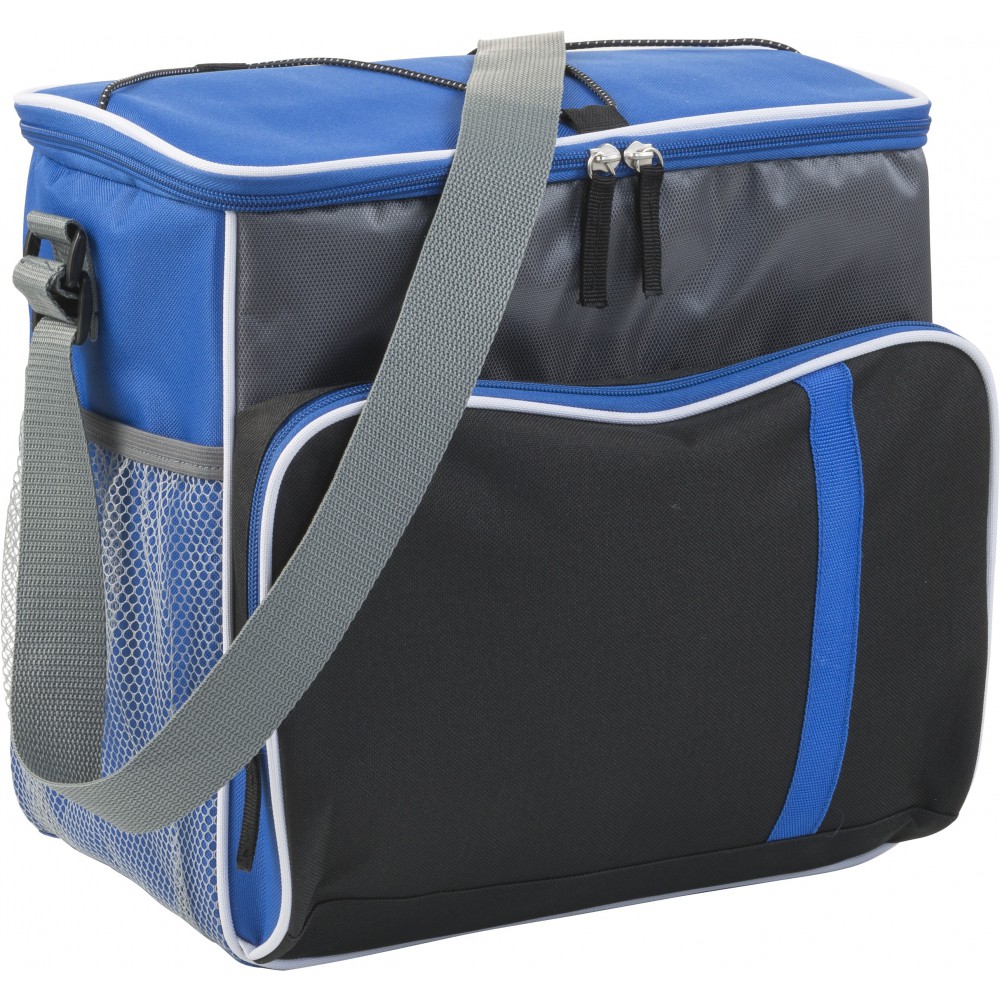 600D poliészter hűtőtáska cipzáros első zsebbel, egy nagy cipzáros résszel, hálós oldalzsebekkel és a tetején elasztikus összefogópánttal.