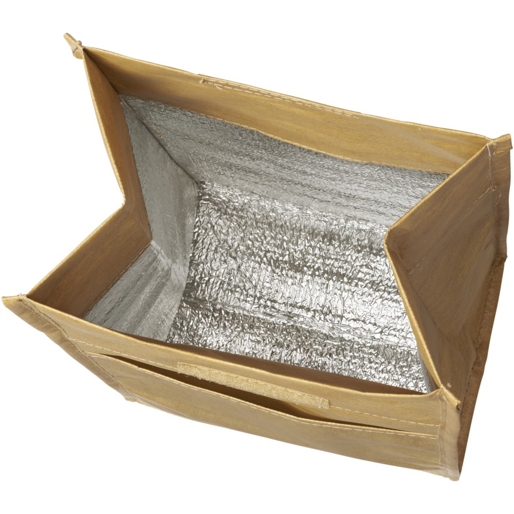 Hagyományos stílusú hűtőtáska nagy, hőszigetelt fő résszel, felcsavarható záródással. 12 db üdítősdoboz számára is alkalmas. Anyaga: 110g-os laminált, nemszőtt polipropilén.