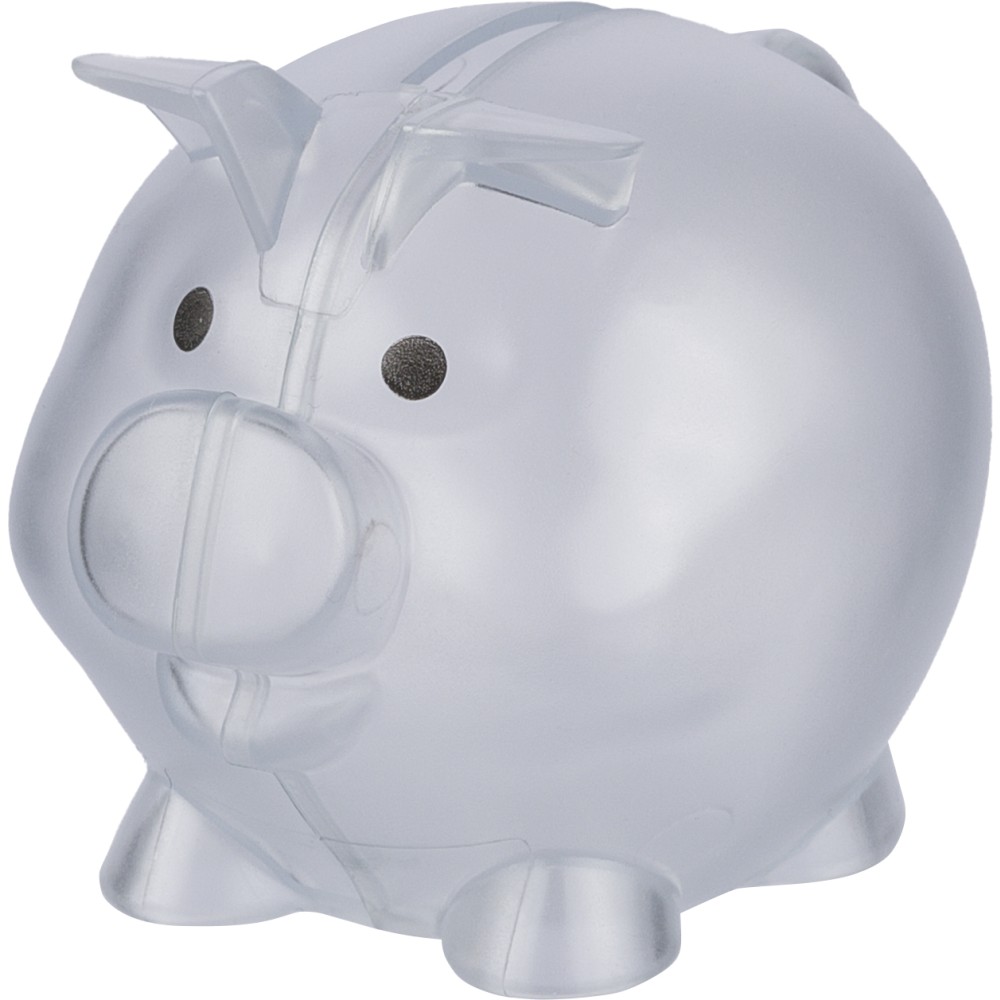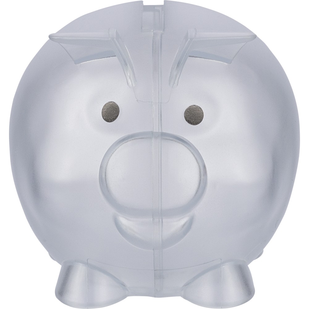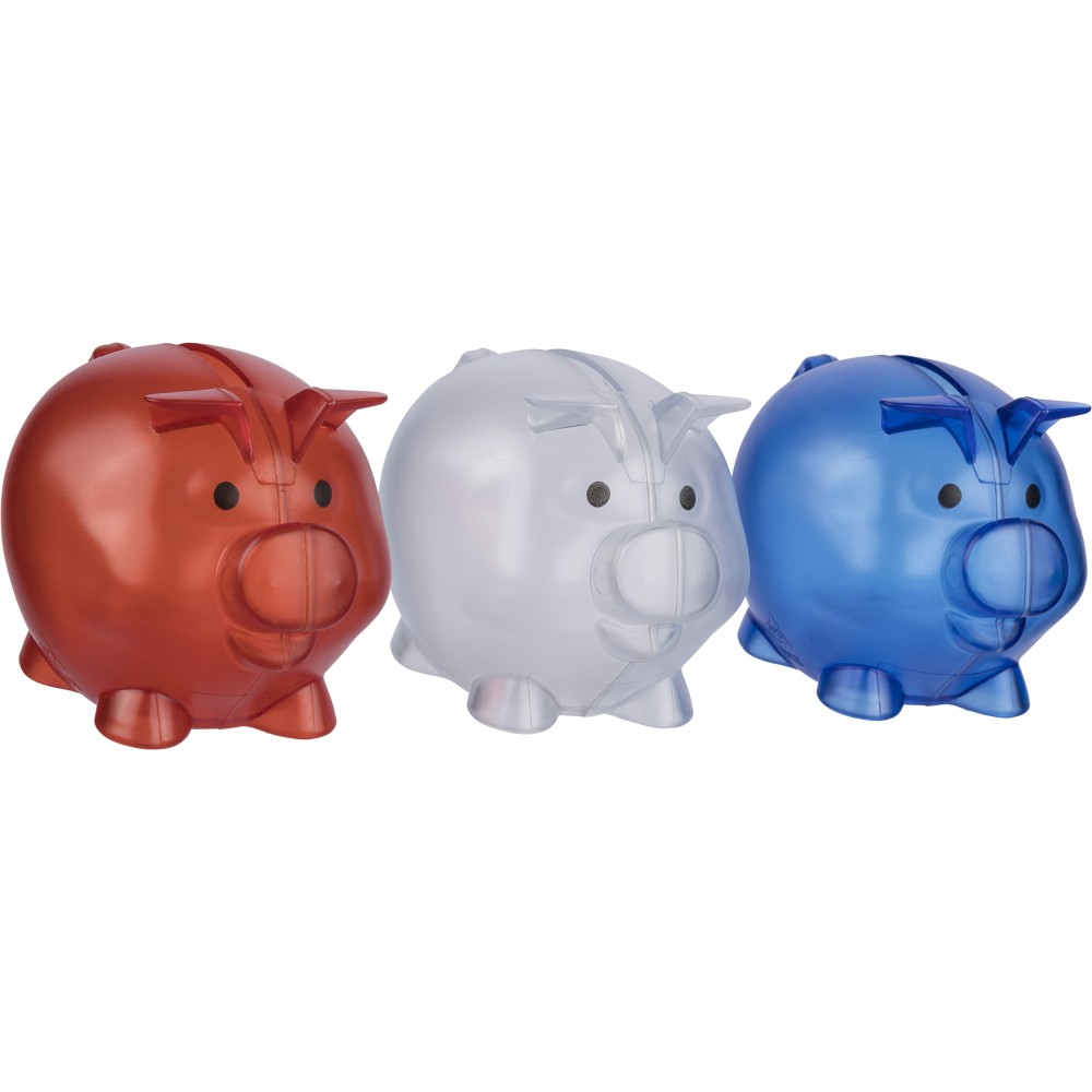 Újrahasznosított PS műanyagból készült, malacpersely. A hátoldalon recycled (újrahasznosított) alapanyagra utaló logó található.