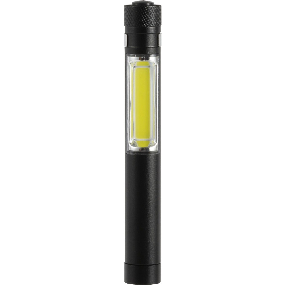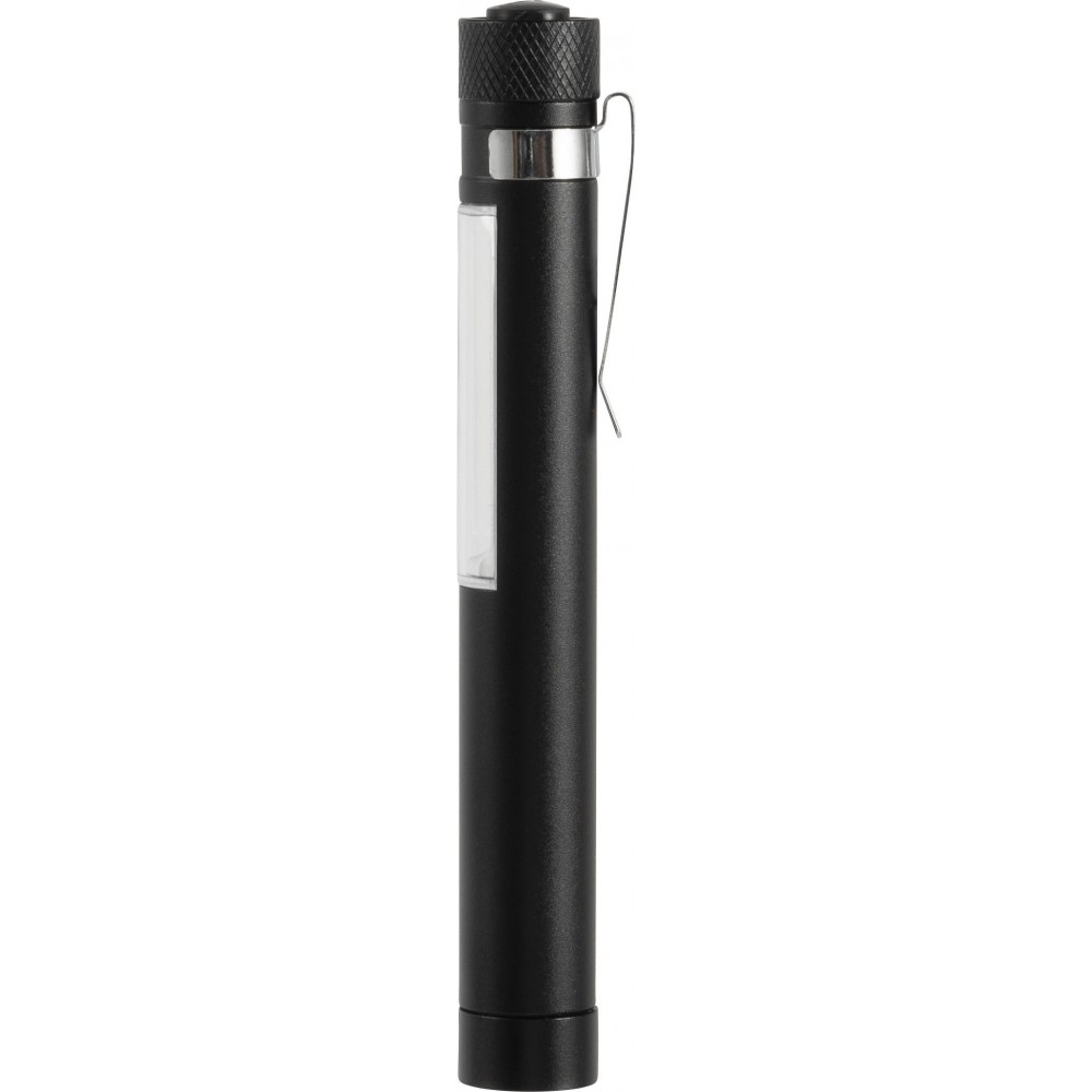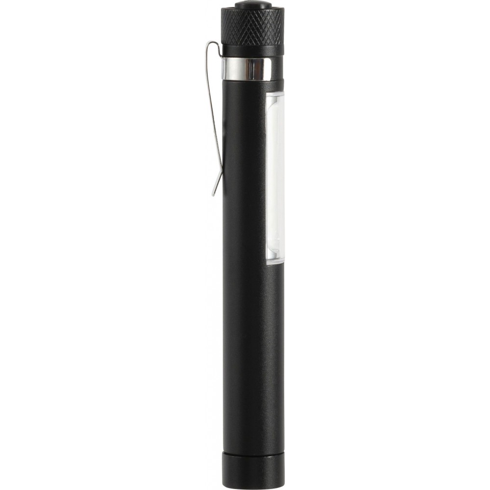 COB zseblámpa (50 lumen) mágnessel az alján és fém zsebklipsszel. Tartalmaz elemeket. Egyenként fehér dobozba csomagolva. Anyaga: alumínium.