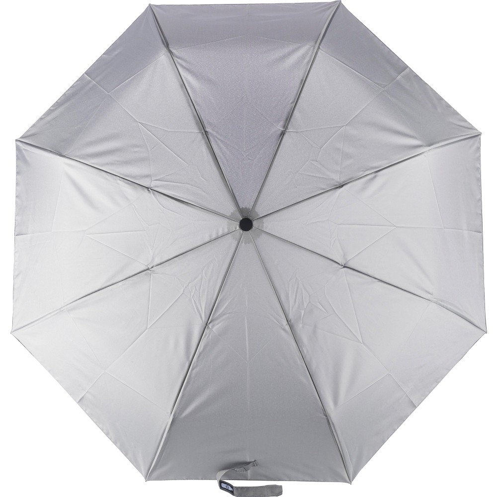 Automata nyitású és zárású, összecsukható esernyő 8 panellel, tokkal. Nyele gumis mintázatú, az autók abroncsára emlékeztet. Vászna RPET pongee anyag. Mérete: 21".