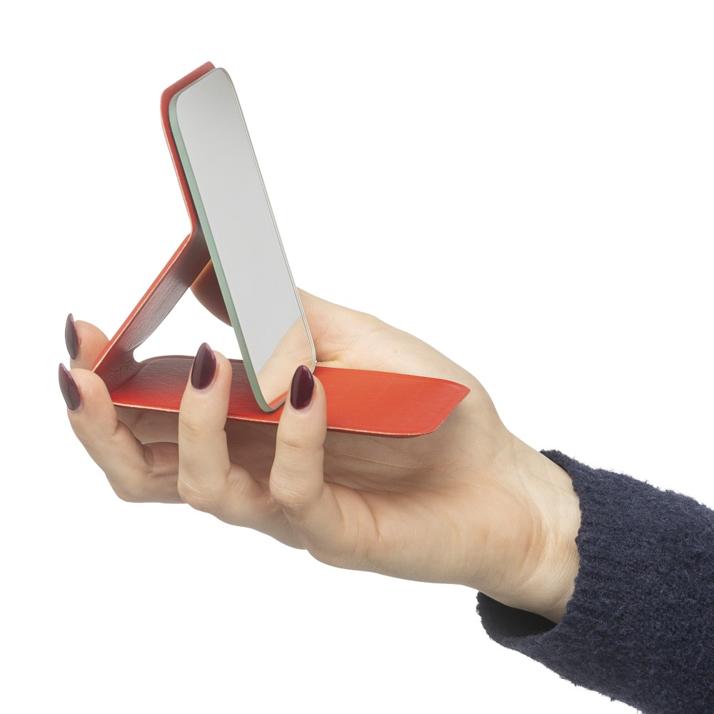 Üvegtükör összehajtható, újrahasznosított PU borítással, amely kinyitva álló helyzetben használható. A borításon dombornyomott, újrahasznosított alapanyagra utaló logó található. Papírtasakba csomagolva.