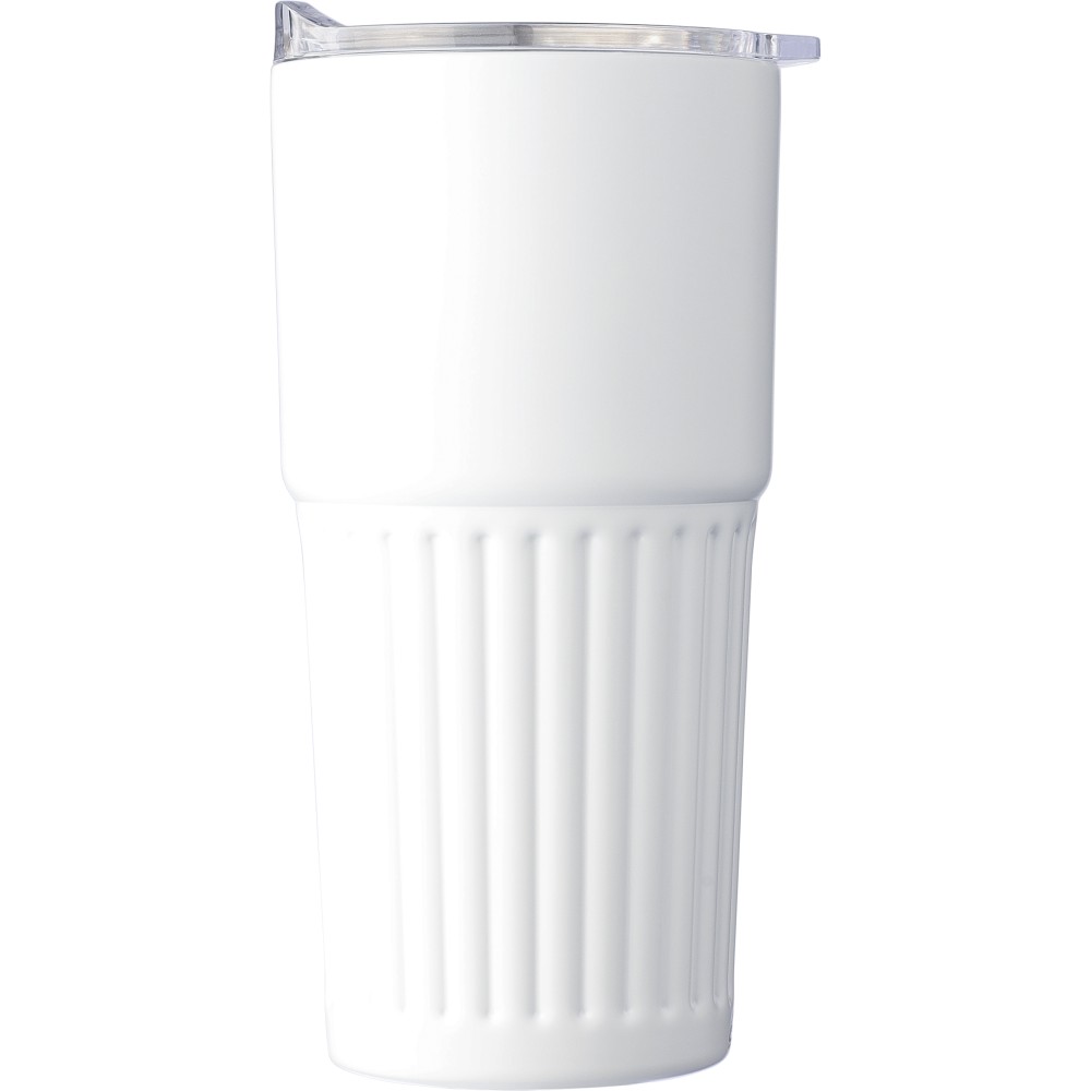 Újrahasznosított rozsdamentes acél útibögre, 450 ml. A belső 304-es, a külső 201-es rozsdamentes acélból készült, bordás markolattal, műanyag, csúszózáras fedéllel. Gravírozott újrahasznosított logó található a bögrén. Csomagolása barna papírdoboz.