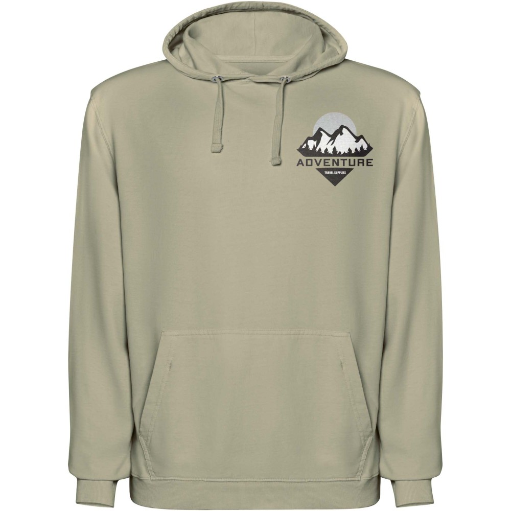 Koptatott (acid-wash) felületkezeléssel készült uniszex kapucnis pulóver, amely 2x1 bordás kötésű kézelőkkel és alsó szegéllyel készült. A kapucni színazonos single jersey bélést és passzoló lapos húzózsinórokat kapott, a nyakrésznél pedig esztétikus, színazonos fedőöltés található. A pulóver praktikus kenguruzsebbel rendelkezik a kényelmes használat érdekében. 100% pamut, 250 g/m2.