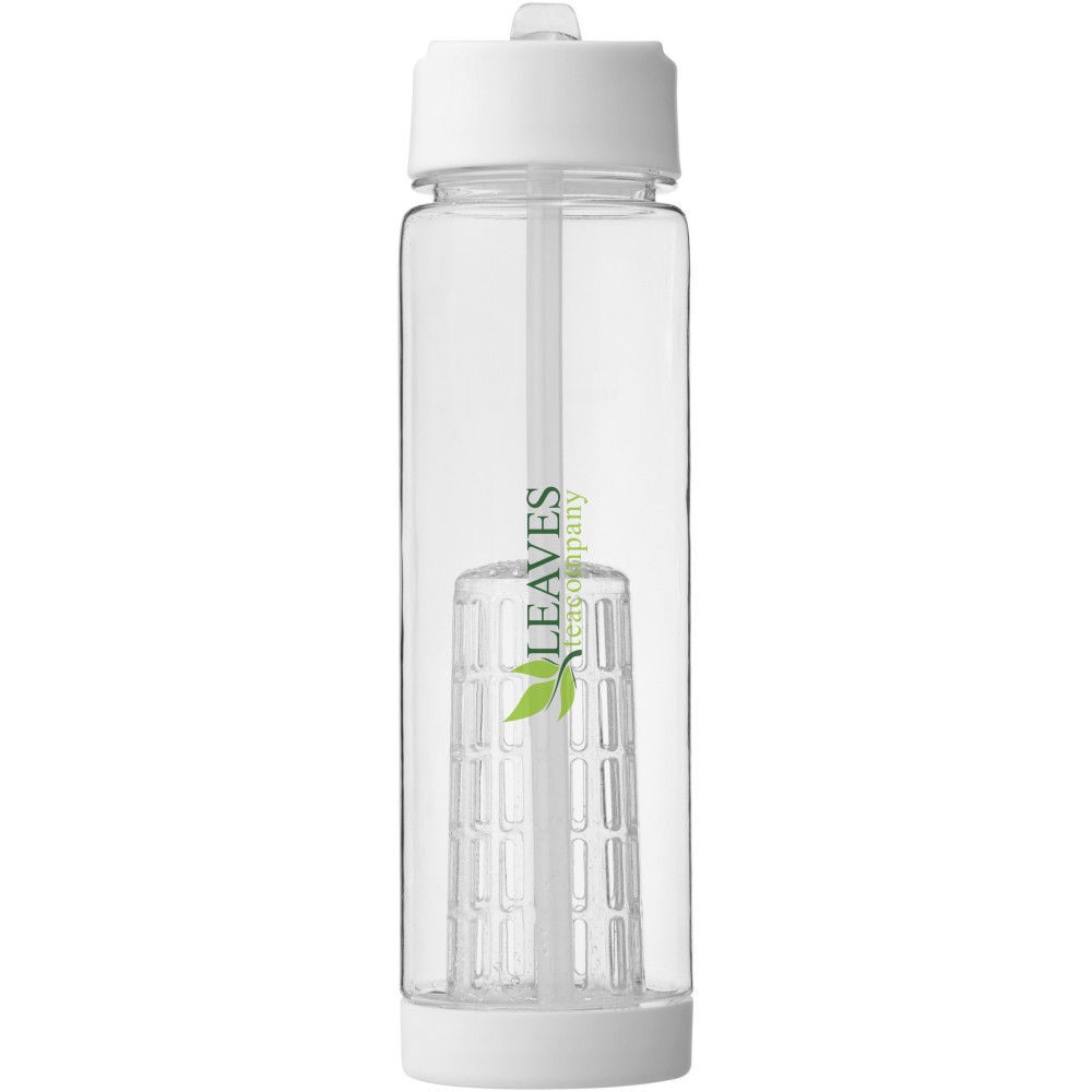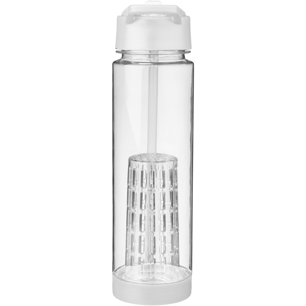 Tutti Frutti palack szűrőbetéttel, csavaros kupakkal, felpattintható ivócsővel. A szűrőbetétnek köszönhetően italunkba könnyen szűrhető módon tehetünk gyümölcsöt, zöldfűszert, zöldséget: mentát, citromfüvet, uborkát, levendulát, stb. A palack Eastman Tritan anyagból készült, így BPA-mentes, könnyű, tartós, szagmentes és ütésálló. Nem szivárgásmentes. Szénsavas italokkal nem használható. Mosogatógépben nem mosható és mikrohullámú sütőben történő melegítésre nem alkalmas. Űrtartalom: 740 ml.