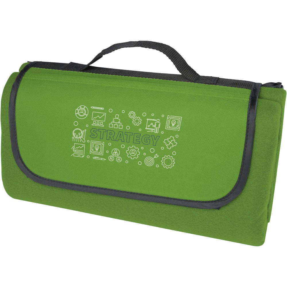 Vízálló, 140 g/m2-es pikniktakaró újrahasznosított PET műanyagból, fenntartható választás. Összecsukva és rögzítve a takaró könnyen tárolható és hordozható a mellékelt fogantyúval.