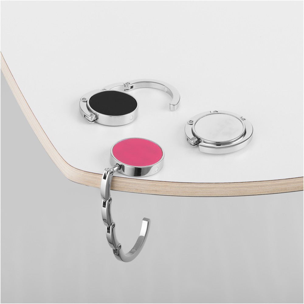 Összehajtható táskaakasztó, mellyel tisztán és biztonságban tarthatja táskáját. Az akasztót bármely felszín peremére felrögzítheti, max. 4,5 kg súlyt bír el. Fekete ajándékdobozban.