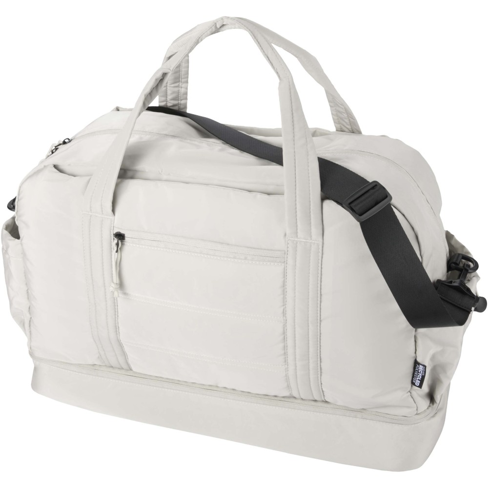 A Puffer sporttáska egyedi megjelenést ötvöz prémium minőségű, GRS tanúsítvánnyal rendelkező újrahasznosított alapanyagokkal, így ideális választás a mindennapi használathoz. A 30 literes űrtartalom tökéletes rövid utazásokhoz, edzéshez vagy hétköznapi teendőkhöz. A táska tágas, cipzáras fő rekesszel rendelkezik ruhák és felszerelések számára, valamint egy szigetelt, PEVA bélésű alsó rekesszel, amely lehetővé teszi a nedves és száraz holmik elkülönítését. A több belső és külső zseb segíti az átlátható rendszerezést, míg a bőröndre rögzíthető pánt, az állítható vállpánt és a kézifogantyúk sokoldalú hordozási lehetőséget biztosítanak. Könnyű és vízlepergető kialakításának köszönhetően ez a sporttáska könnyedén alkalmazkodik az életviteledhez.