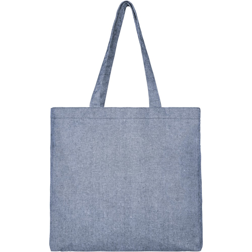 Széles bevásárlótáska 210 g / m2 újrahasznosított pamut poliészter keverékből. Az újrahasznosított pamut textilipari szabászati hulladékból ered. Az újrahasznosított anyag természetéből fakadóan kisebb eltérések lehetnek a színben. Fülmagasság 31 cm. Terhelhető: 10 kg-ig. Újrahasznosított pamut, 210 g/m2, újrahasznosított poliészter.