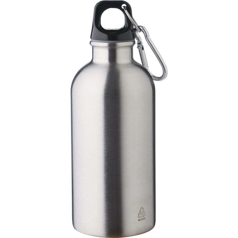 Újrahasznosított rozsdamentes acélból készült 400 ml-es szimplafalú kulacs PP kupakkal és alumínium karabinerrel. Az újrahasznosított anyagra utaló logó a palackra van gravírozva. Mosogatógépben nem tisztítható.