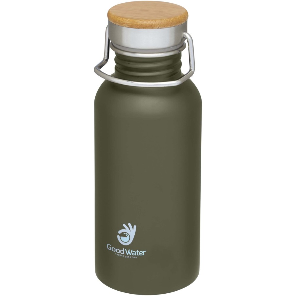 Egyfalú rozsdamentes acél palack csavaros tetővel. A fedélen bambusz rátét, valamint egy fül a könnyű hordozhatóságért. Szivárgásmentes. Szénsavas italokkal nem használható. Mosogatógépben nem mosható és mikrohullámú sütőben történő melegítésre nem alkalmas. Űrtartalom: 550 ml. Csomagolása Avenue díszdoboz. Rozsdamentes acél, bambusz.
